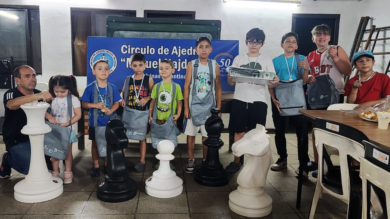 El martes 23 de diciembre, mientras afuera llovía un montón, hicimos un torneo con los chicos que vinieron a la clase de ajedrez. Participaron todos, hasta los más chiquitos. Estuvieron Dylan, Máximo, David, Daivid, Renzo, Joaquín, Eric, Camilo, Vicente y Lucia. Si bien el ganador absoluto fue Dylan, todos recibieron medallas y bolsos de recuerdo. También sorteamos un juego nuevito, que llevó David. Por supuesto, brindamos con los chicos y sus papás, con nuestros deseos de unas felices fiestas y un mejor 2026. |